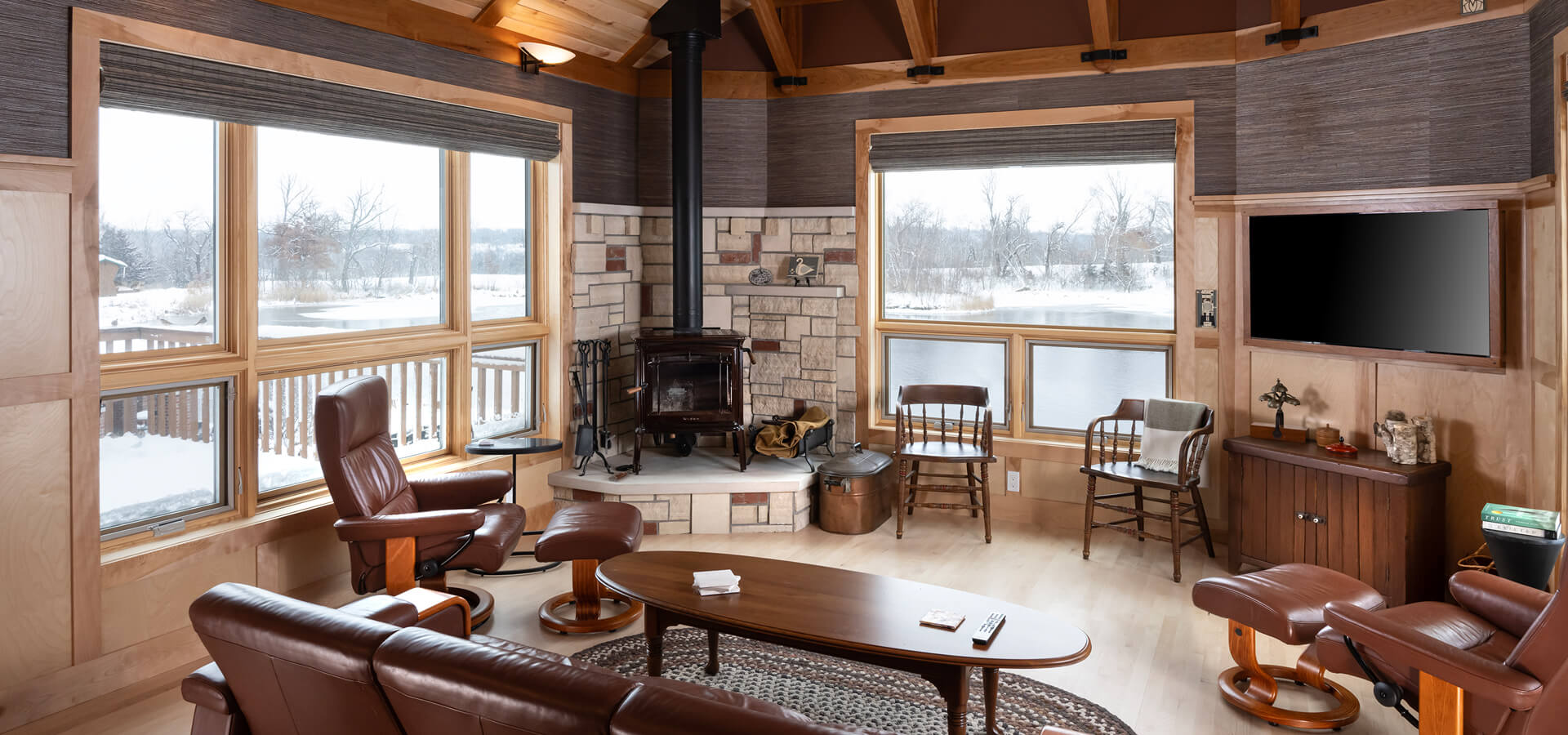 Custom cherry and reclaimed slate provide a delightful juxtaposition of cabinet and countertop/backsplash combination. Salvaged redwood, new maple, and birch trim details are accented with the owner’s private tile collection and natural limestone. The large windows and a new woodstove in the sunroom perch the owners over their lake view in a cozy embrace. This traditional embrace of materials is packed full of intimate discoveries